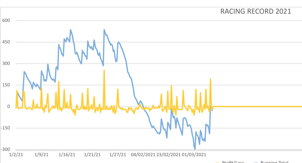 Early – February was a mess with late changes, horses not running to form and a generally things not going as desired, last Saturday however (6 March) with us having our second best day of the year turning thing around for us and putting us back in the black at 2 points profit.